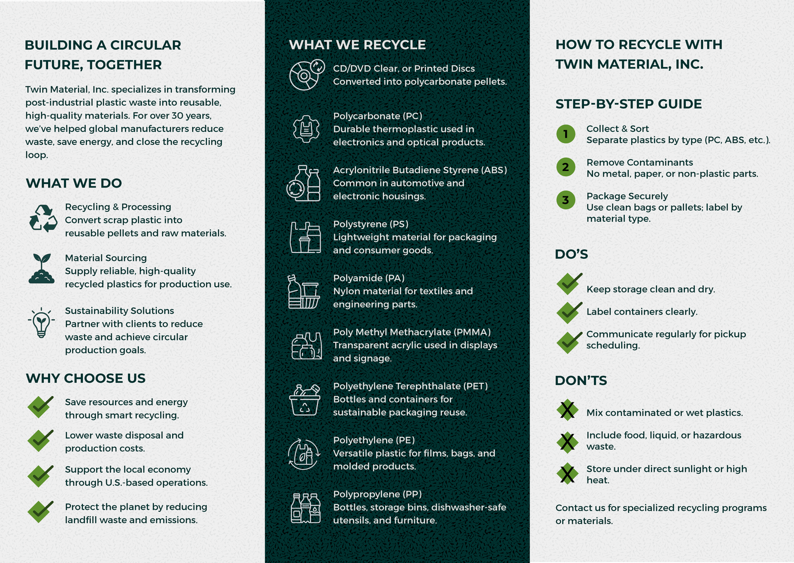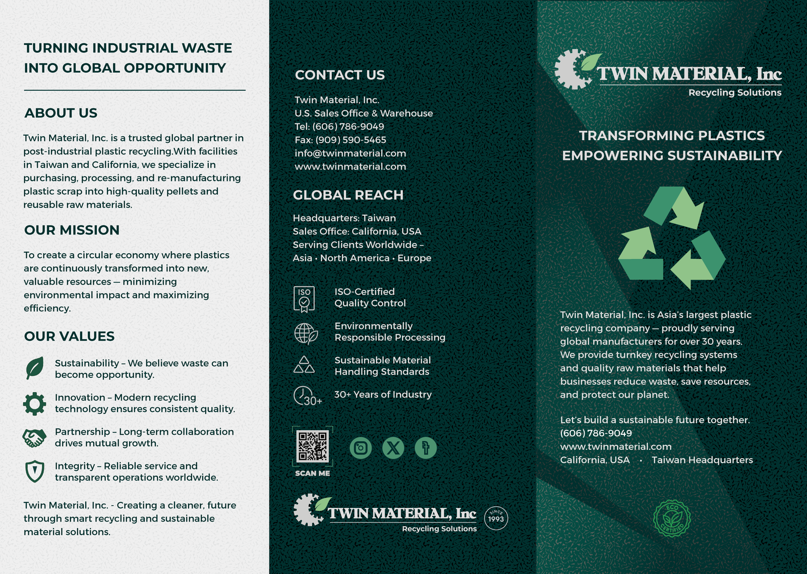 Twin Material, Inc., the largest recycling company in Asia, specializes in transforming post-industrial plastic waste into reusable raw materials. With over 30 years of experience in Taiwan and a growing presence in the U.S. market, their goal is to expand visibility, credibility, and connection with potential partners at CES Las Vegas, the world’s most influential tech event.