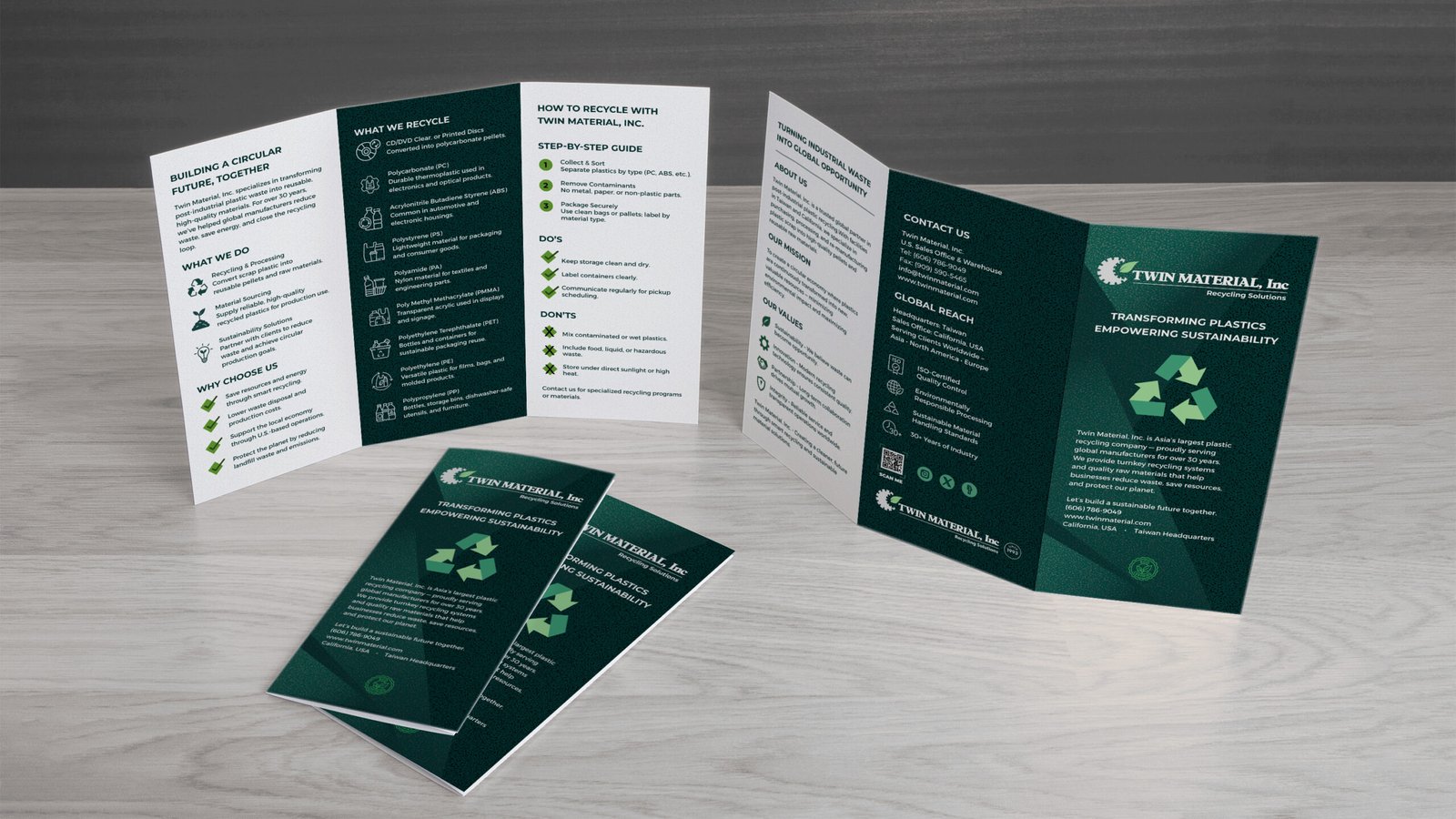 • Brochures: To make the brochure visually engaging, I added the circular recycling symbol subtly at the center. In addition, I used icon table for easy scanning and each plastic type should have its own icon.